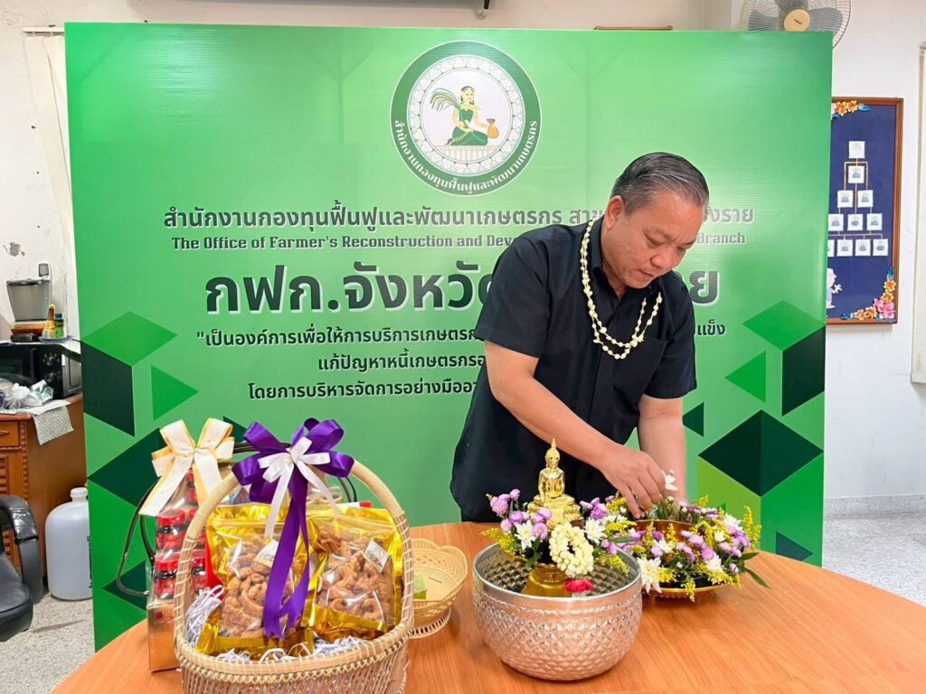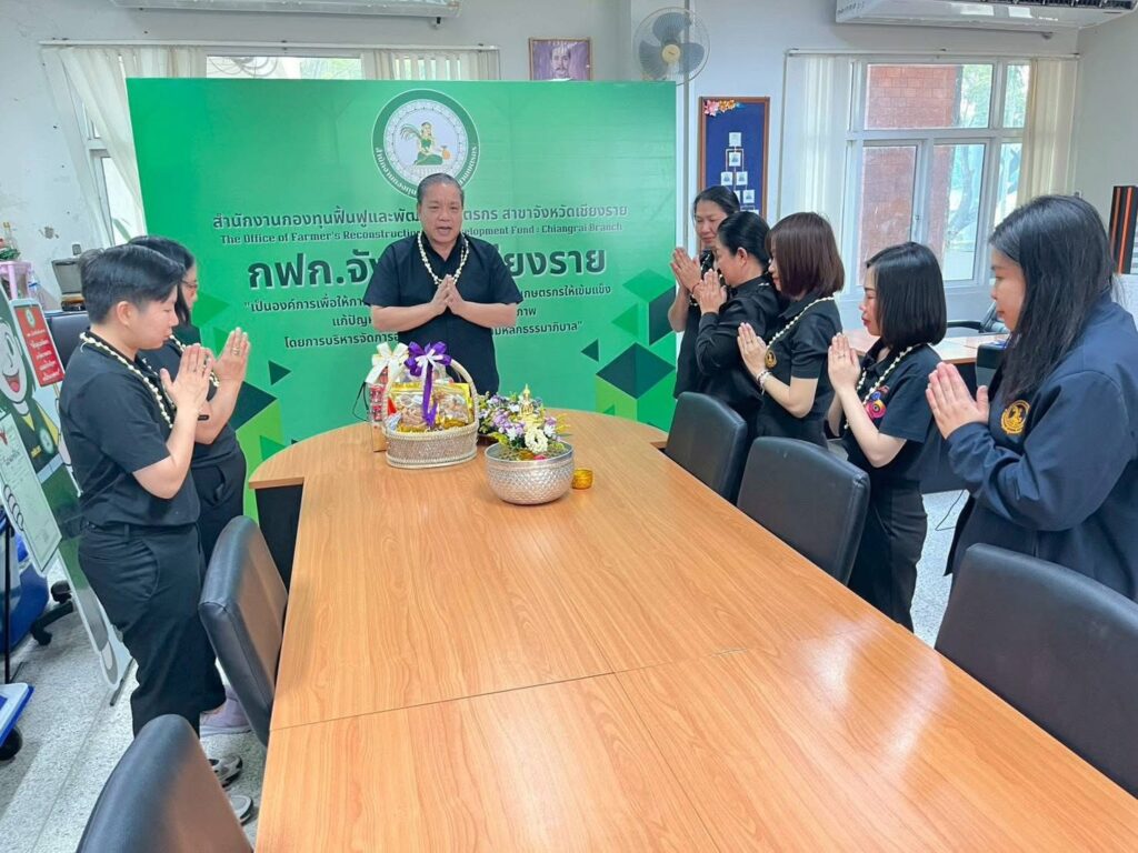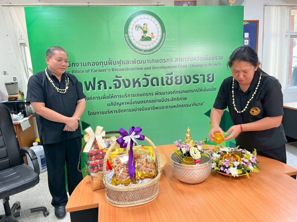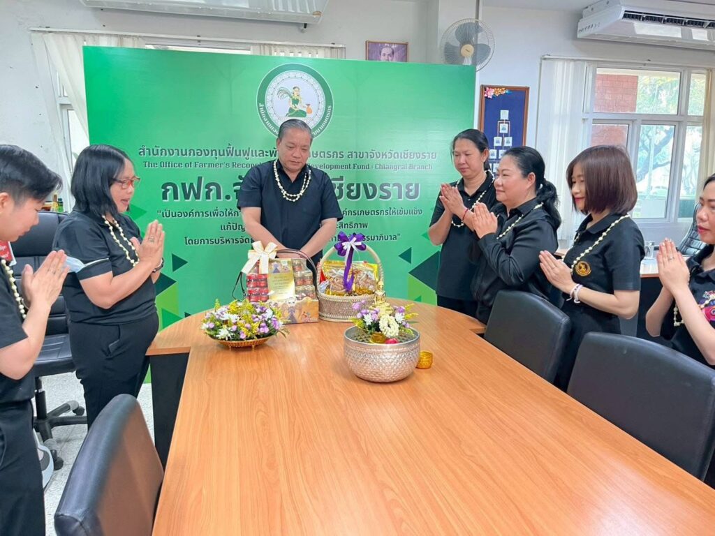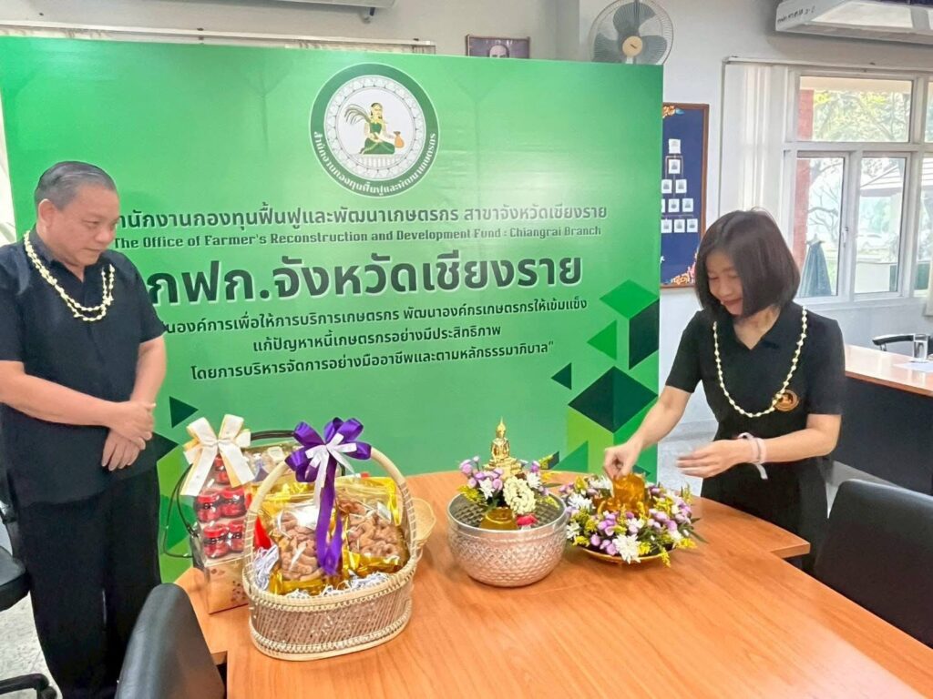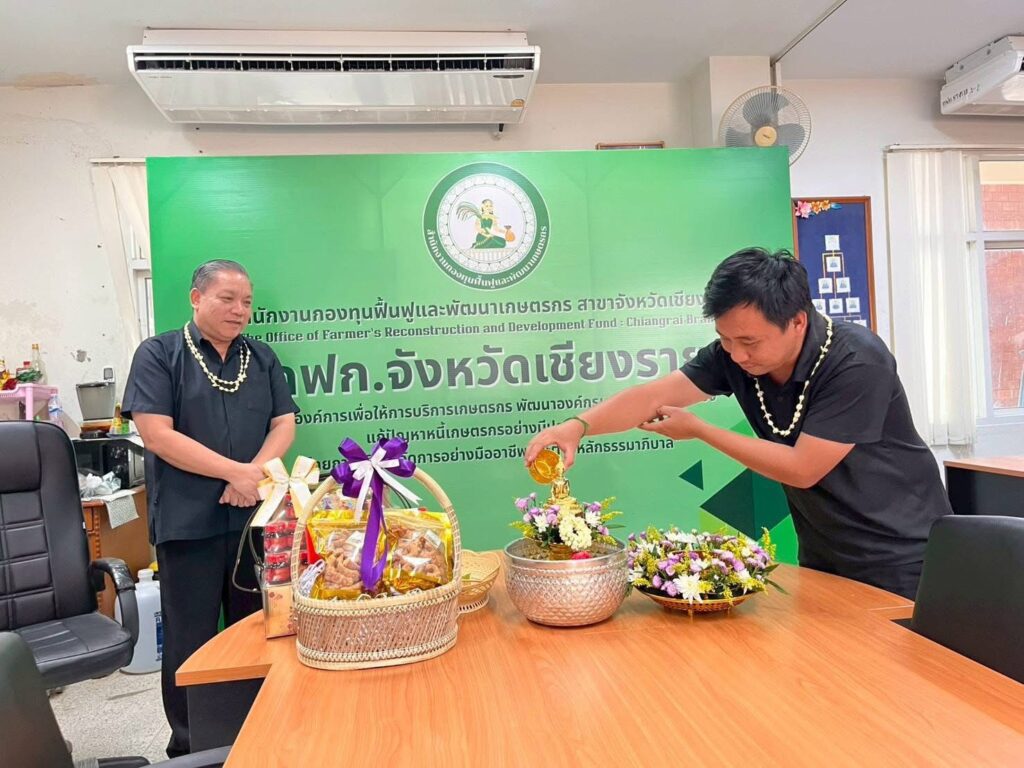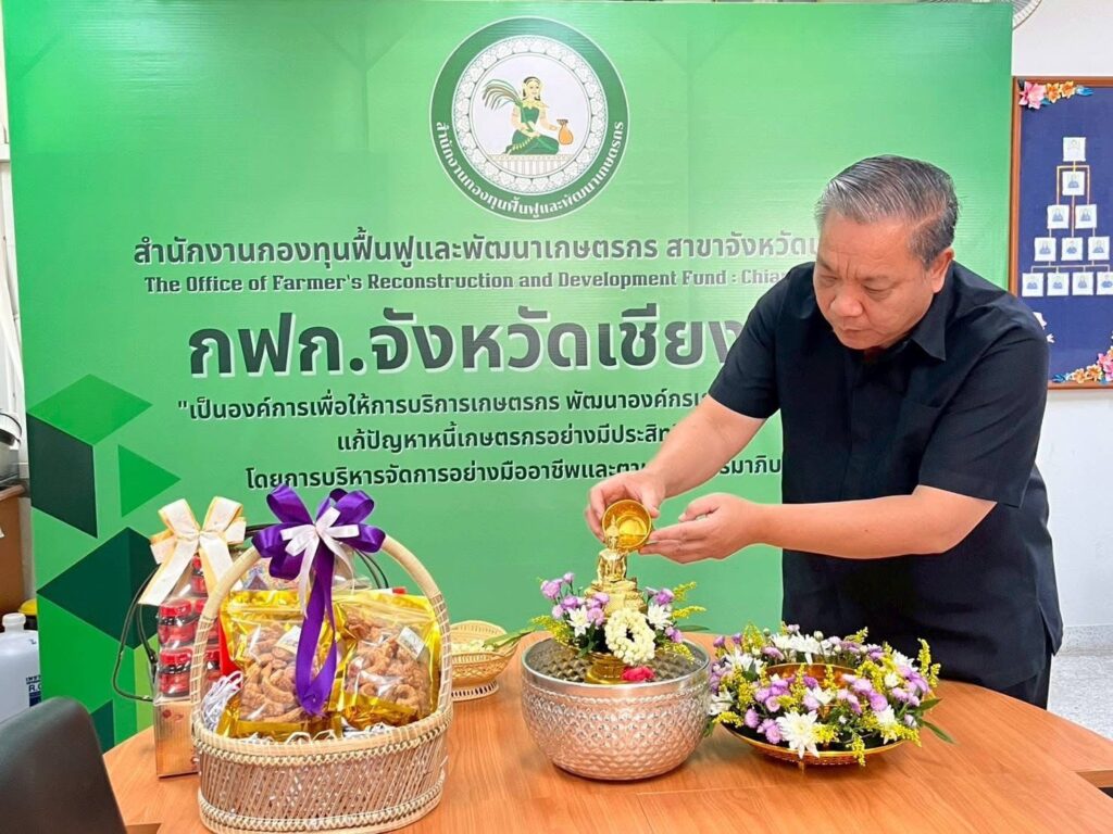 วันที่ 16 เมษายน 2569 เวลา 09.29 น. สำนักงานกองทุนฟื้นฟูและพัฒนาเกษตรกร สาขาจังหวัดเชียงราย (กฟก.) จัดพิธีสรงน้ำพระ และรดน้ำดำหัวนายนิยม สุวรรณประภา หัวหน้าสำนักงานกองทุนฟื้นฟูและพัฒนาเกษตรกร สาขาจังหวัดเชียงราย (กฟก.) เนื่องในวันสงกรานต์ 2569 ณ สำนักงานกองทุนฟื้นฟูและพัฒนาเกษตรกร สาขาจังหวัดเชียงราย (กฟก.) ศาลากลางจังหวัดเชียงราย ชั้น 1