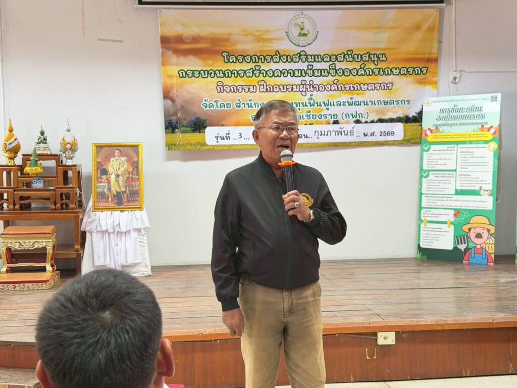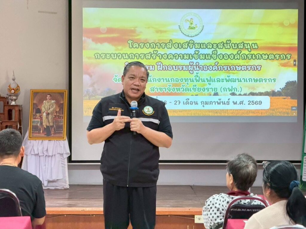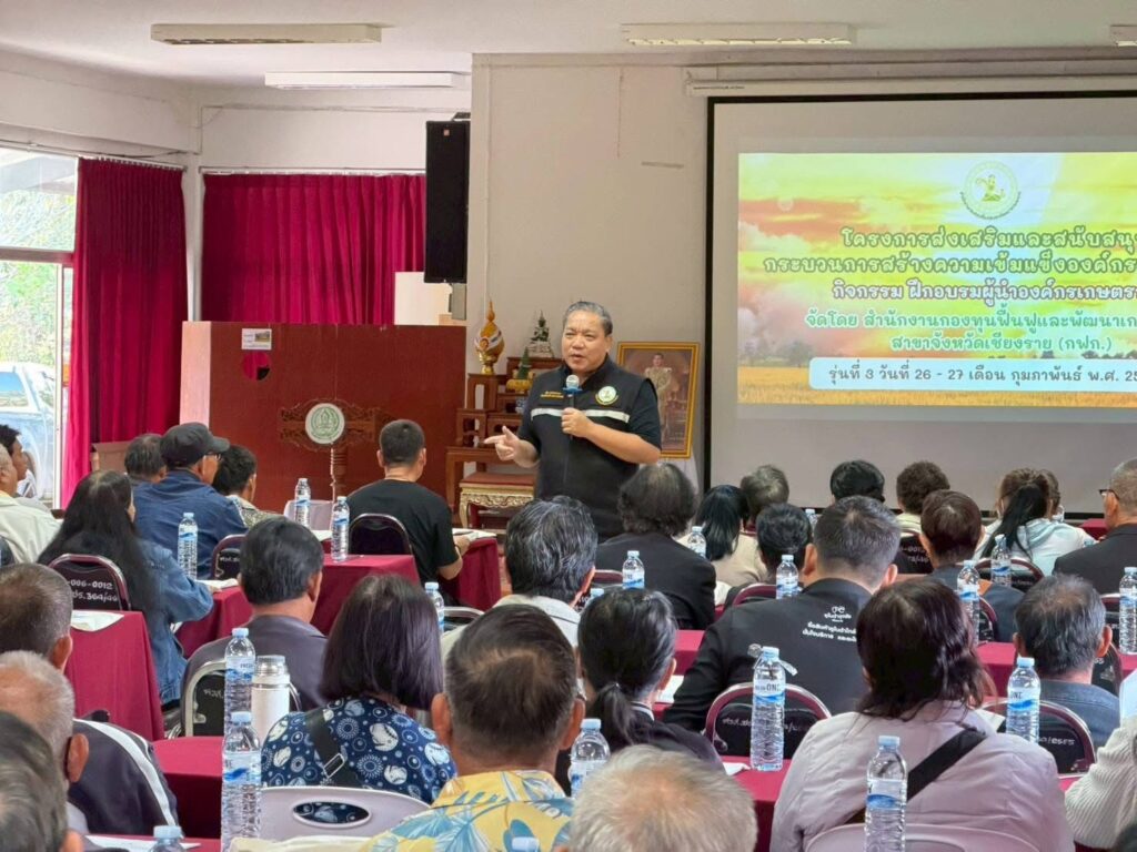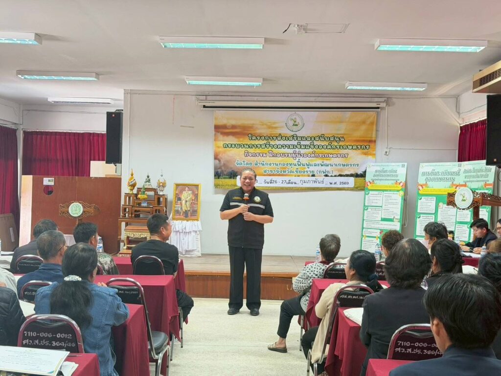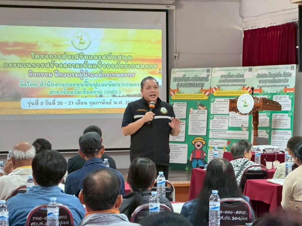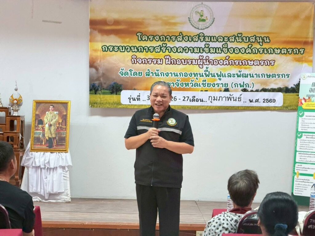 วันที่ 27 กุมภาพันธ์ 2569 นายนิยม สุวรรณประภา หัวหน้าสำนักงานกองทุนฟื้นฟูและพัฒนาเกษตรกร สาขาจังหวัดเชียงราย (กฟก.) เป็นประธานปิดการอบรม และมอบเกียรติบัตรให้ผู้แทนองค์กรเกษตรกร ที่ผ่านการการอบรมผู้นำองค์กรเกษตรกร หลักสูตรการพัฒนาองค์กรเกษตรกรให้เข้มแข็งภายใต้วิกฤติโลกสู่การพัฒนาที่ยั่งยืน ภายใต้โครงการส่งเสริมและสนับสนุนกระบวนการสร้างความเข้มแข็งองค์กรเกษตรกร รุ่นที่ 3 ระหว่างวันที่ 26 – 27 กุมภาพันธ์ 2569 ประจำปีงบประมาณ 2569 จำนวน 28 องค์กร เกษตรกร จำนวน 140 คน ณ ห้องประชุมศูนย์วิจัยพืชสวนเชียงราย อำเภอเมืองเชียงราย จังหวัดเชียงราย