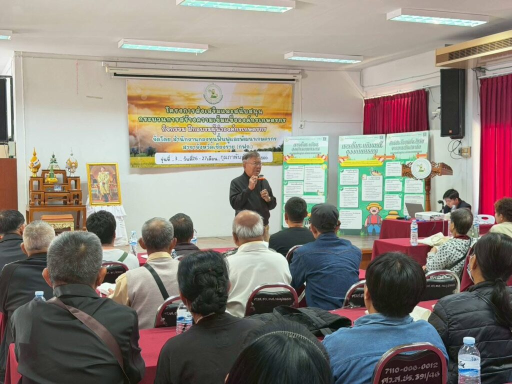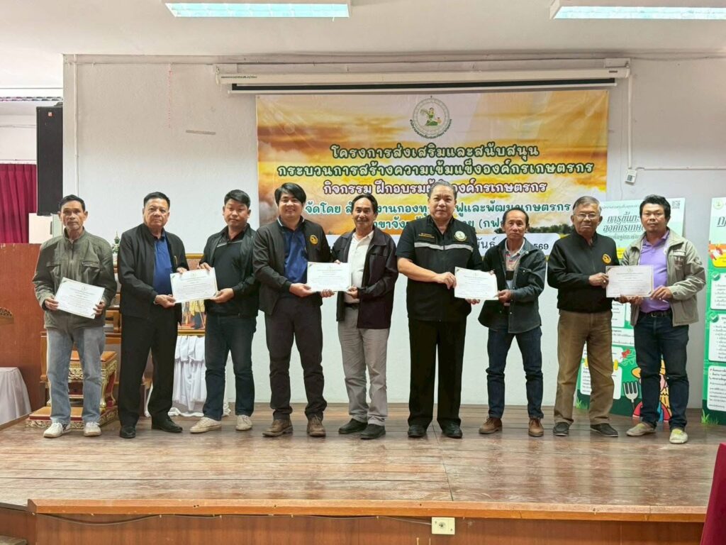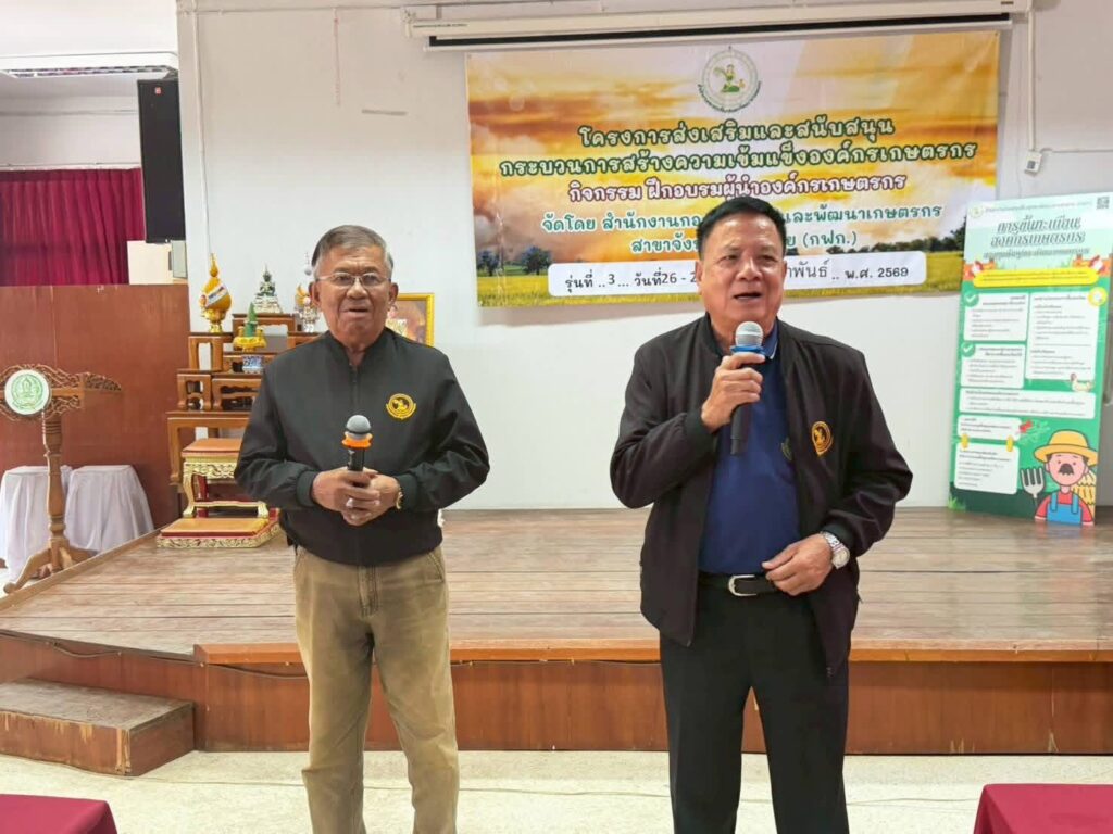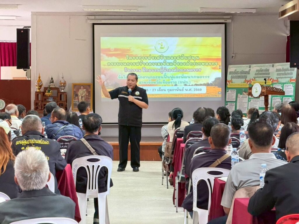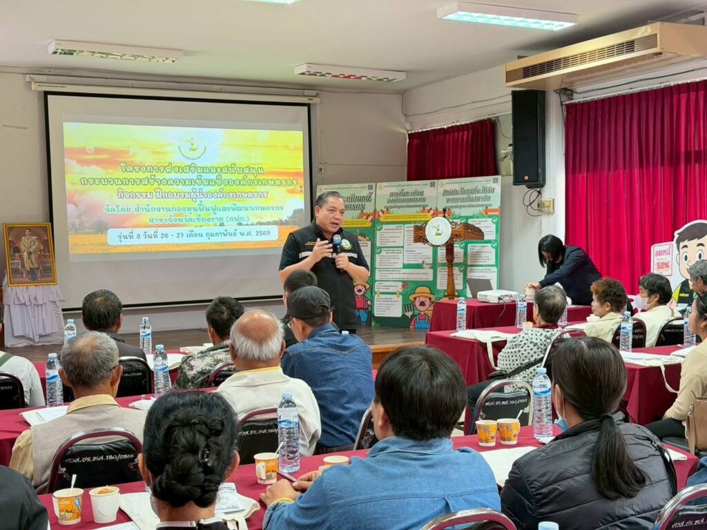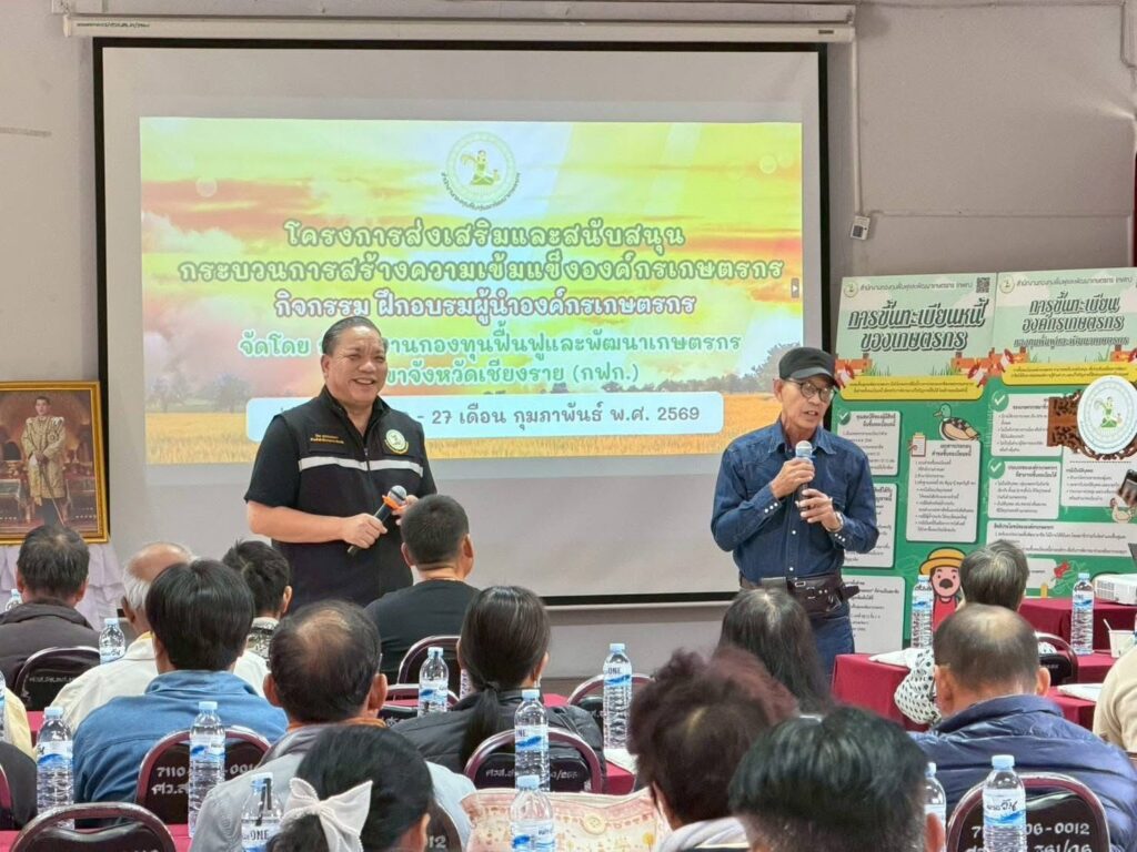 วันที่ 27 กุมภาพันธ์ 2569 นายนิยม สุวรรณประภา หัวหน้าสำนักงานกองทุนฟื้นฟูและพัฒนาเกษตรกร สาขาจังหวัดเชียงราย (กฟก.) เป็นประธานปิดการอบรม และมอบเกียรติบัตรให้ผู้แทนองค์กรเกษตรกร ที่ผ่านการการอบรมผู้นำองค์กรเกษตรกร หลักสูตรการพัฒนาองค์กรเกษตรกรให้เข้มแข็งภายใต้วิกฤติโลกสู่การพัฒนาที่ยั่งยืน ภายใต้โครงการส่งเสริมและสนับสนุนกระบวนการสร้างความเข้มแข็งองค์กรเกษตรกร รุ่นที่ 3 ระหว่างวันที่ 26 – 27 กุมภาพันธ์ 2569 ประจำปีงบประมาณ 2569 จำนวน 28 องค์กร เกษตรกร จำนวน 140 คน ณ ห้องประชุมศูนย์วิจัยพืชสวนเชียงราย อำเภอเมืองเชียงราย จังหวัดเชียงราย