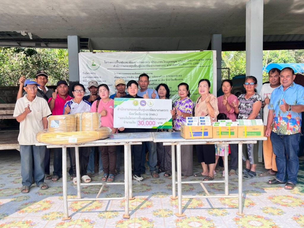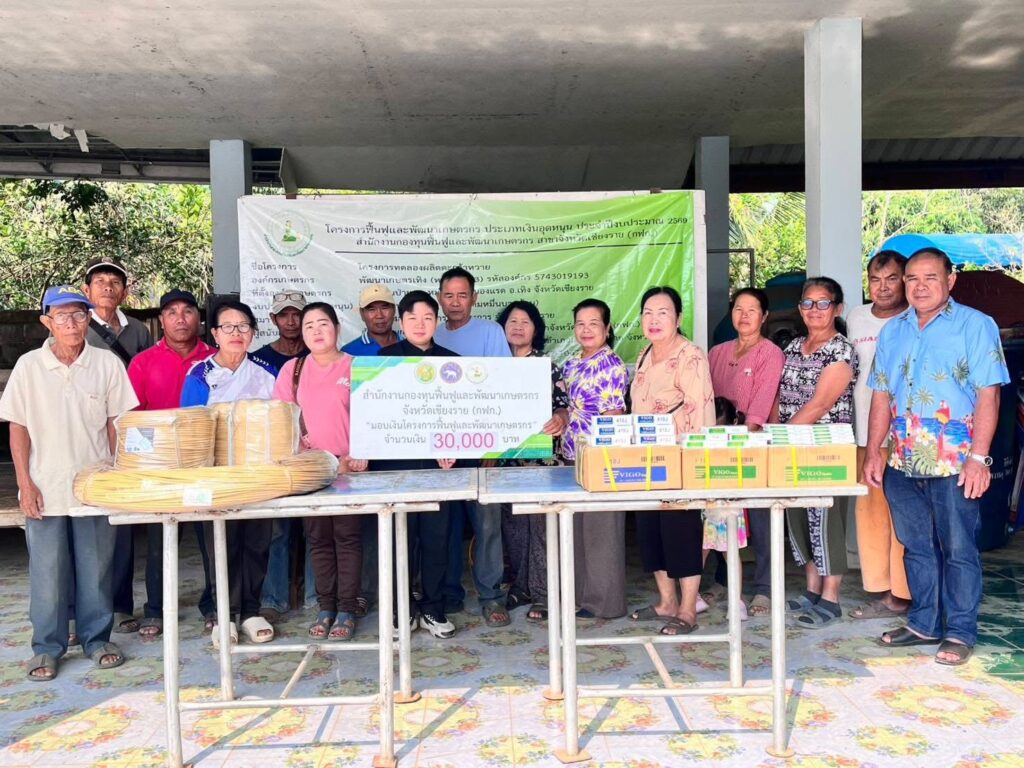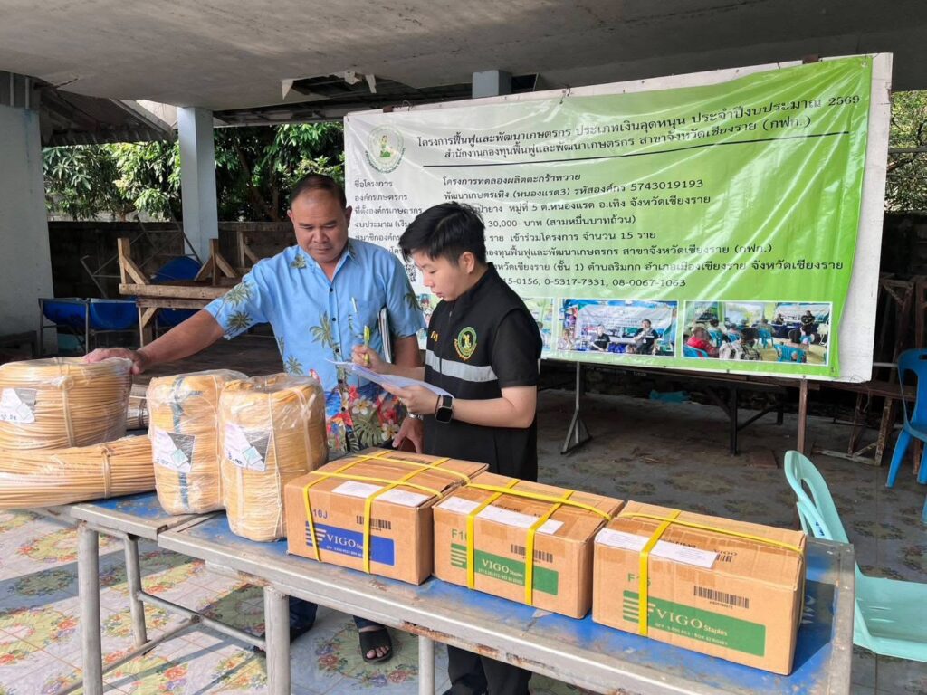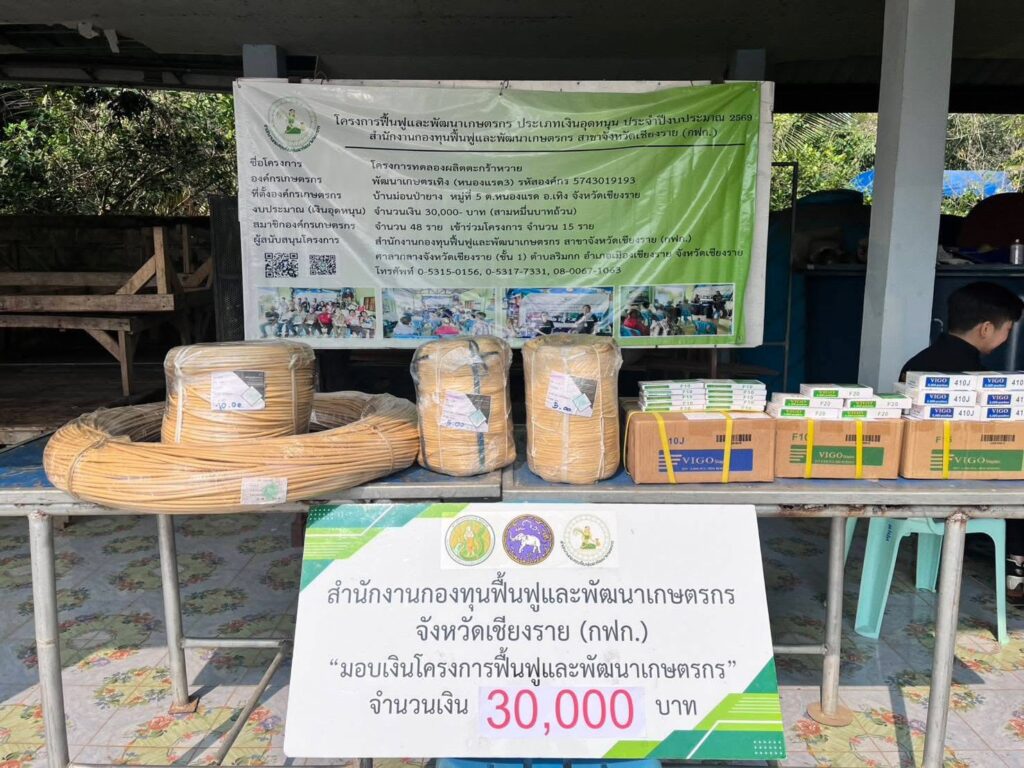 วันที่ 4 มีนาคม 2569 เวลา 09.30 น. นายนิยม สุวรรณประภา หัวหน้าสำนักงานกองทุนฟื้นฟูและพัฒนาเกษตรกร สาขาจังหวัดเชียงราย (กฟก.) มอบหมายให้นางสาวจุฑาทิพย์ ปินตาสาร ผู้ปฏิบัติงานสำนักงานสาขาจังหวัด เเละนายณัฐภูมิ เข็มขาว ผู้ปฏิบัติงานกลุ่มงานบริการ ลงพื้นที่มอบเงินอุดหนุนโครงการฟื้นฟูและพัฒนาเกษตรกร และร่วมกิจกรรม/ส่งมอบวัสดุสำหรับผลิตตะกร้าหวาย (หวายเส้น/ลูกแม็ก) ให้องค์กรเกษตรกร กลุ่มพัฒนาเกษตรเทิง หนองแรด 3 ณ อาคารอเนกประสงค์บ้านม่อนป่ายาง หมู่ที่ 5 ตำบลหนองแรด อำเภอเทิง จังหวัดเชียงราย