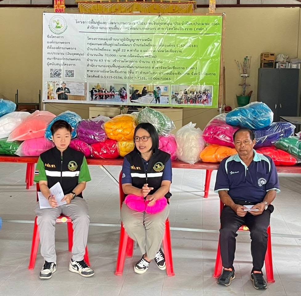 วันที่ 15 ตุลาคม 2568 เวลา 10.00 น. นายนิยม สุวรรณประภา หัวหน้าสำนักงานกองทุนฟื้นฟูและพัฒนาเกษตรกร สาขาจังหวัดเชียงราย (กฟก.) มอบหมายให้ นางสุกัญญา แสงหล้า พนักงานอาวุโส นางสาวจุฑาทิพย์ ปินตาสาร ผู้ปฏิบัติงานสำนักงานสาขา และนายณัฐภูมิ เข็มขาว ผู้ปฏิบัติงานกลุ่มงานบริการ ลงพื้นที่ร่วมส่งมอบปัจจัยการผลิต ในการทอตุงล้านนา ให้เกษตรกร กิจกรรมในงวดที่ 2 ให้องค์กรเกษตรกร เกษตรฟื้นฟูร่วมใจพัฒนา บ้านร่มโพธิ์ทอง ณ อาคารอเนกประสงค์ บ้านร่มโพธิ์ทอง หมู่ที่ 22 ตำบลท่าก๊อ อำเภอแม่สรวย จังหวัดเชียงราย