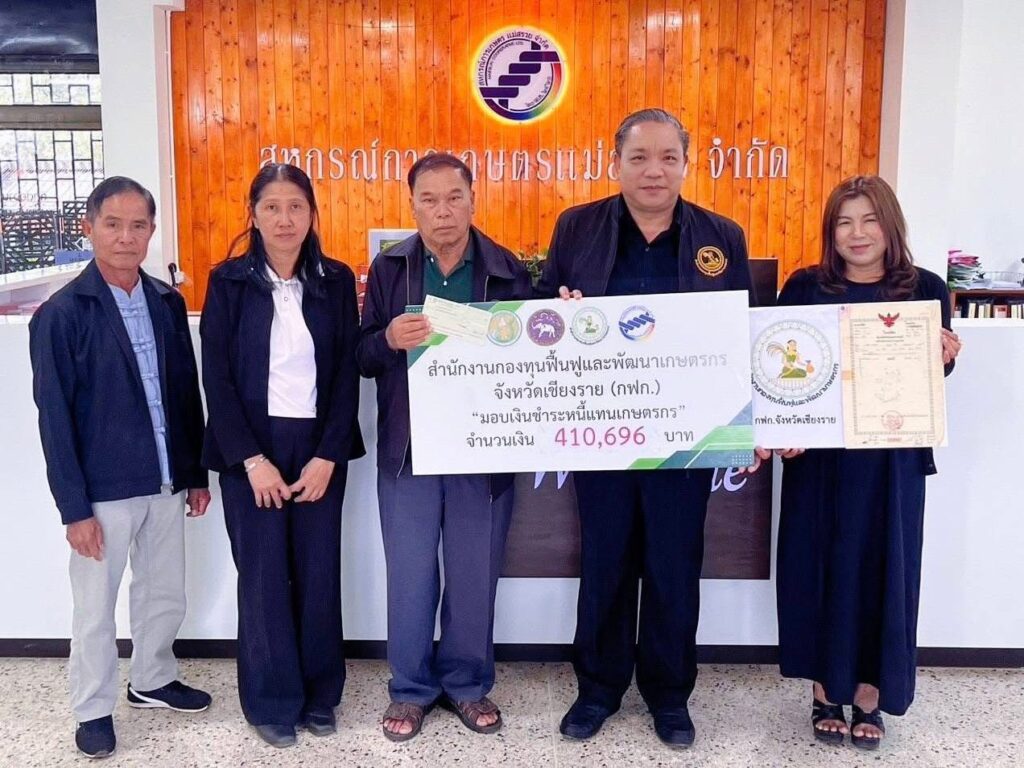 วันที่ 5 กุมภาพันธ์ 2569 เวลา 09.30 น.นายนิยม สุวรรณประภา หัวหน้าสำนักงานกองทุนฟื้นฟูและพัฒนาเกษตรกร สาขาจังหวัดเชียงราย (กฟก.) ได้มอบเงินเพื่อชำระหนี้แทนเกษตรกร อ.แม่สรวยให้กับ สหกรณ์การเกษตรแม่สรวย จำกัด จำนวนเงิน 410,696 บาท โดยมีนายทวี พิมสาร ประธานกรรมการสหกรณ์ นายประสงค์ อินทะนัน รองประธานสหกรณ์ฯ และนางอำไพ อิทธิโชติ ผู้จัดการสหกรณ์ฯ เป็นผู้รับมอบ ณ สหกรณ์การเกษตรแม่สรวย จำกัด