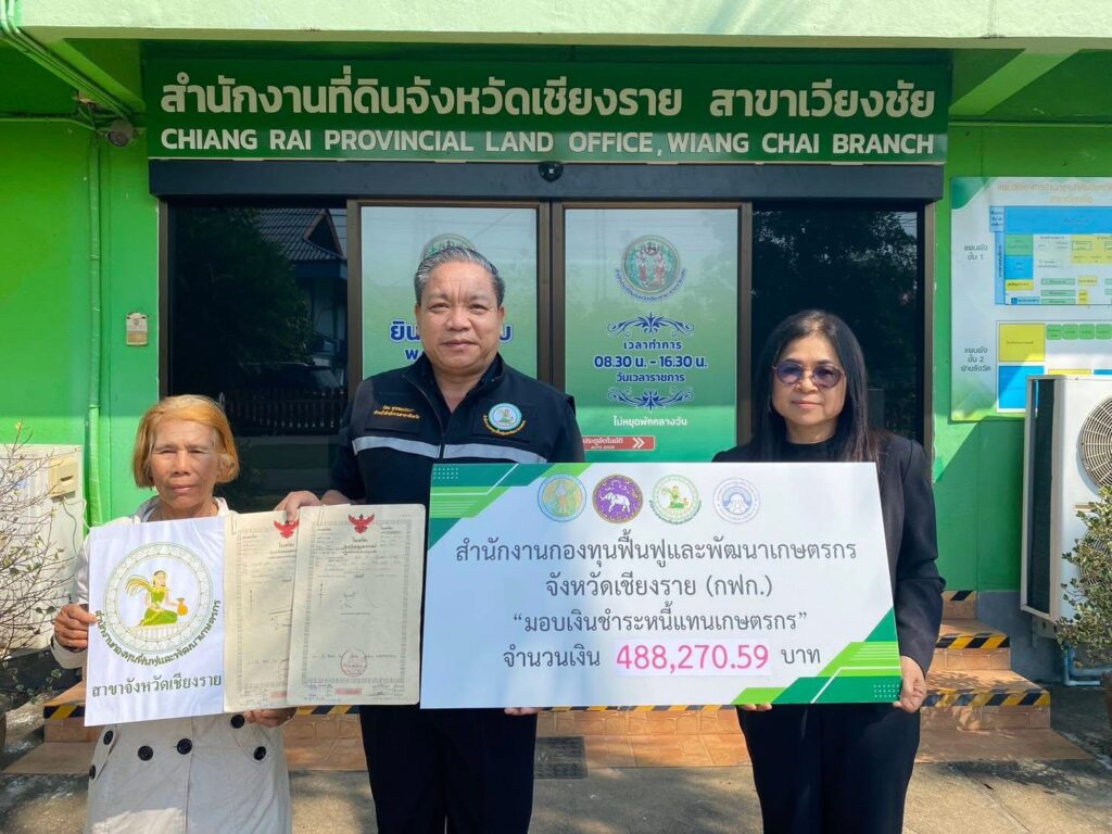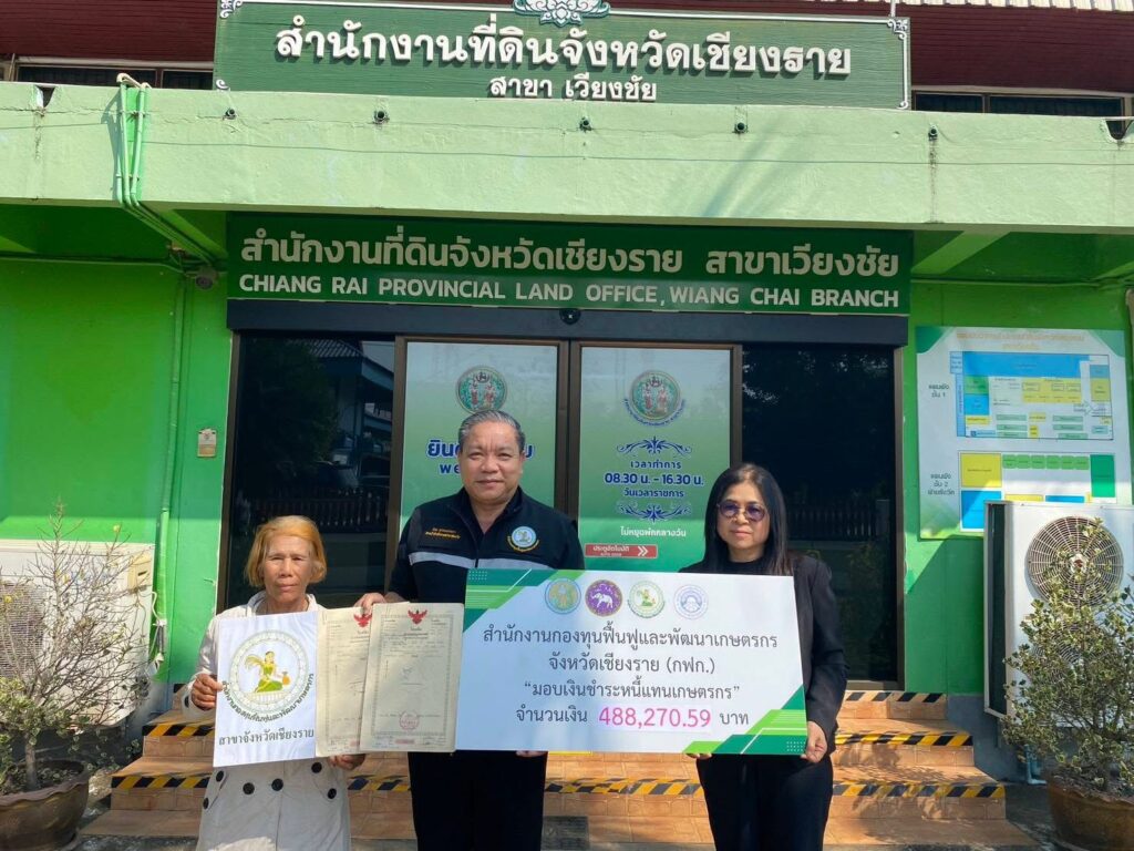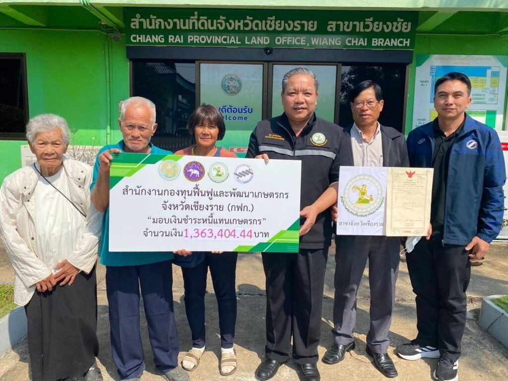 กฟก.เชียงราย มอบเงิน 1.8 ล้านกว่าบาท ชำระหนี้แทนเกษตรกร กลุ่มลูกหนี้สหกรณ์ฯ อ.เวียงชัยและ อ.เวียงเชียงรุ้ง รักษาที่ดินให้เกษตรกร 20 กว่าไร่