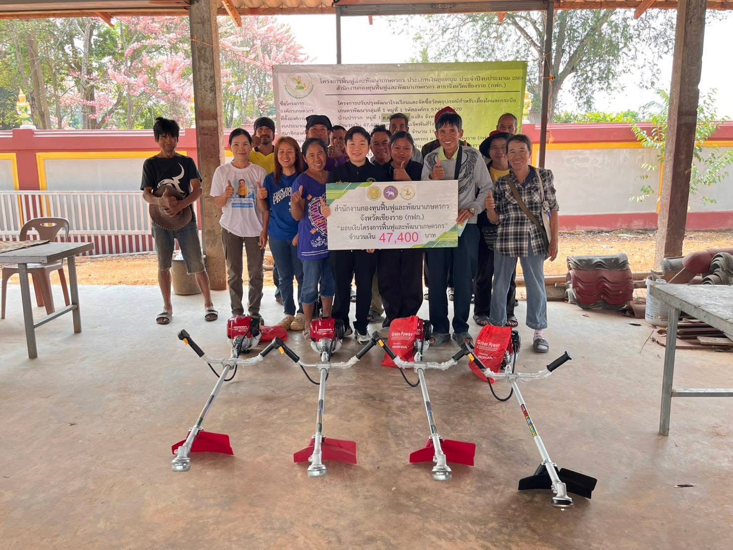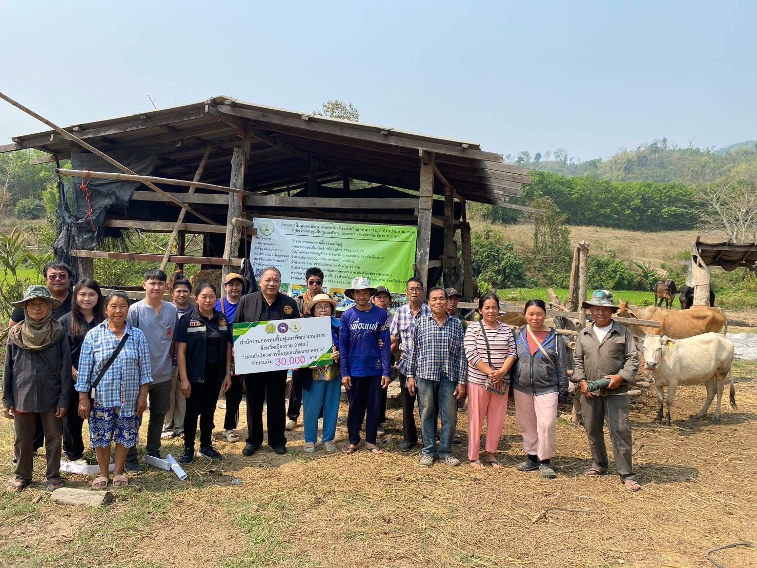 วันที่ 10 มีนาคม 2569 เวลา 13.00 น. นายนิยม สุวรรณประภา หัวหน้าสำนักงานกองทุนฟื้นฟูและพัฒนาเกษตรกร สาขาจังหวัดเชียงราย (กฟก.) มอบหมายให้นางสาวจุฑาทิพย์ ปินตาสาร นางสาวกัญนมนต์ จันทร์ภิรภูพัชร ผู้ปฏิบัติงานสำนักงานสาขาจังหวัด เเละนายณัฐภูมิ เข็มขาว ผู้ปฏิบัติงานกลุ่มงานบริการ ลงพื้นที่มอบเงินอุดหนุนโครงการฟื้นฟูและพัฒนาเกษตรกร และร่วมกิจกรรม/ส่งมอบเครื่องตัดหญ้า/เครื่องบดหญ้า/ซาเล้งพ่วงข้าง และเมล็ดพันธุ์หญ้ารูซี่ ให้องค์กรเกษตรกร กลุ่มทำนาบ้านห้วยก้างนาล้อม หมู่ 11 ณ บ้านห้วยก้างนาล้อม หมู่ที่ 11 ตำบลไม้ยา อำเภอพญาเม็งราย จังหวัดเชียงราย