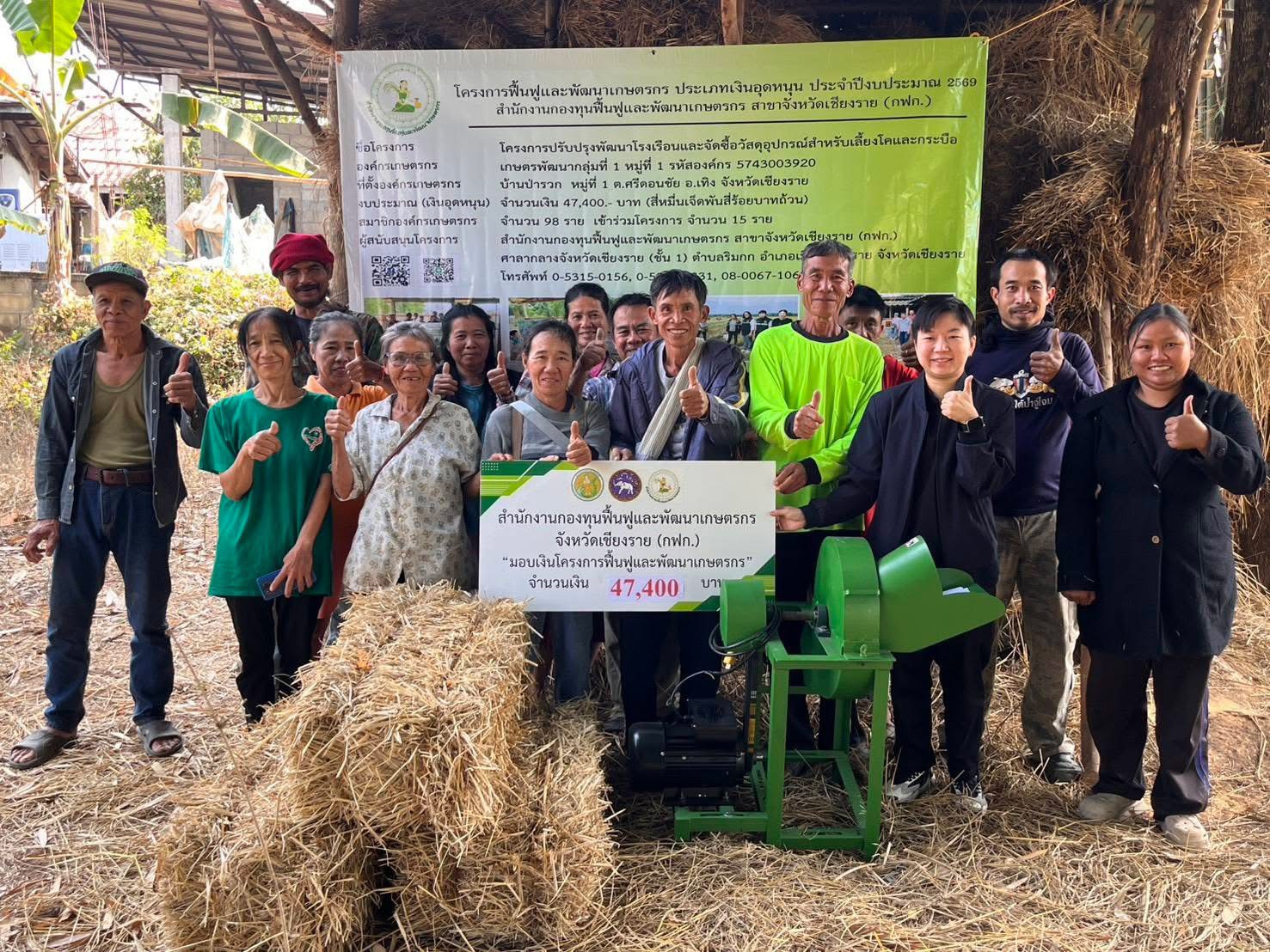 กฟก.จังหวัดเชียงราย มอบเงินอุดหนุนโครงการฟื้นฟูและพัฒนาเกษตรกร และร่วมกิจกรรมส่งมอบเครื่องสับหญ้าและฟางอัดก้อน ให้องค์กรเกษตรกร อำเภอเทิง